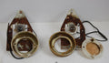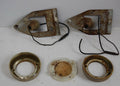 This is a pair of left and right rear interior lamp bezel assembly's from our 1964 Galaxie. The plates with the bulbs do have surface rust as you can see, but they appear solid with life left and have the wire attached. The plastic bezels are worn down to the original plastic resin with no chrome coating on them anymore, but they are both whole, with no breaks, cracks, tears or warping. There is also one back plate cover for the bezel which does have a slight crack in the center. The other one was broken, as these bezels and backs are fragile. Also included are the screws that were taken out with them.